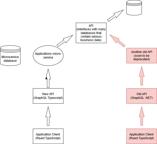 The red indicates the old architecture with the white representing the new architecture I am creating. The applications client and the top level API already exist so it’s up to me to create the microservice and alter the client to use this new API.